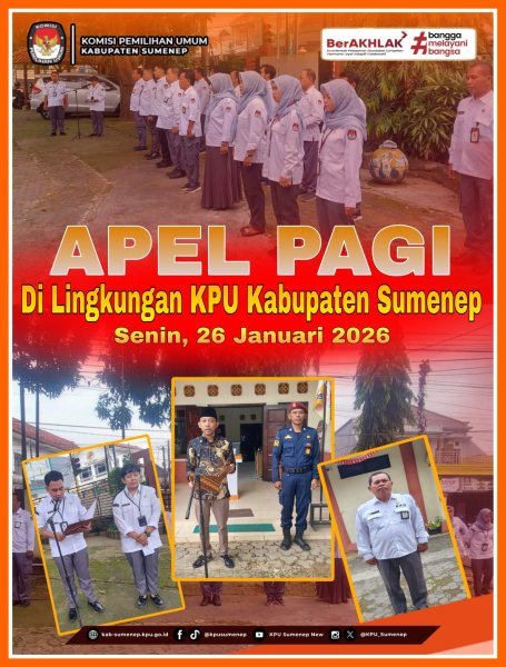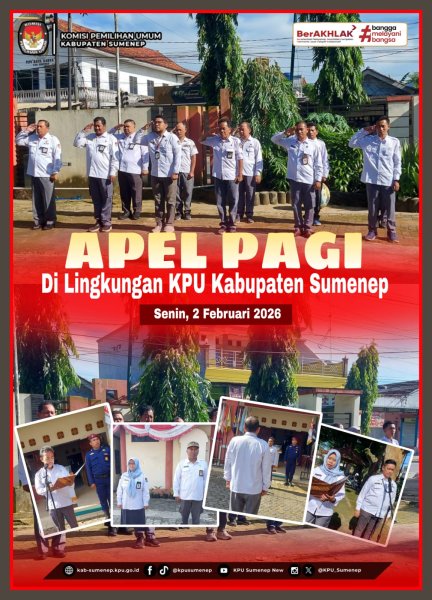 Sumenep, kab-sumenep.kpu.go.id - Komisi Pemilihan Umum Kabupaten Sumenep melaksankan kegiatan apel pagi di halaman KPU Kab. Sumenep, Jl. Raya Gapura, Kec. Kota, Sumenep. Kegiatan tersebut merupakan acara rutin yang digelar oleh KPU kabupaten Sumenep setiap hari Senin pagi. Apel dimulai pukul 07.30 tersebut berjalan dengan tertib dan khidmat (02/02/2026). Kegiatan apel ini diikuti oleh seluruh jajaran kesekretariatan KPU Kabupaten Sumenep. Dedeng Haryanto selaku Sekretaris Komisi Pemilihan Umum Kabupaten Sumenep bertindak sebagai Pembina Apel. Apel pagi rutin ini diharapkan dapat terus menjadi wadah untuk menyamakan persepsi, memperkuat koordinasi, kekompakan, dan meningkatkan semangat kerja seluruh jajaran KPU Kabupaten Sumenep. Kegiatan apel diikuti oleh Sekretaris, Kasubbag, beserta Staf. (Kontributor : Hani / Editor : Saleh / Dokumentasi : Dadang) ....