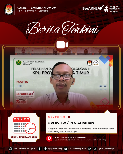 Sumenep, kab-sumenep.kpu.go.id - Komisi Pemilihan Umum Kabupaten Sumenep mengikuti Pengarahan Program Pelatihan Dasar (Latsar) CPNS Tahun 2026 yang diselenggarakan secara daring oleh Balai Diklat Keagamaan Surabaya pada Senin, 2 Februari 2026. Pengarahan disampaikan oleh Danang Eka Sandi dari Balai Diklat Keagamaan (BDK) Surabaya, Danang menekankan pentingnya kedisiplinan peserta, pemahaman mekanisme pembelajaran, serta mengikuti sistem evaluasi yang mencakup evaluasi akademik, aktualisasi, sikap perilaku, dan PKTBT sebagai penentu kelulusan Latsar CPNS. Kegiatan dihadiri oleh 4 (empat) CPNS KPU Kabupaten Sumenep, yakni Moh. Fathorrahim, Alvin Hardian, Hani Nafisah Amaliya, dan Arinta Fanda Ashiilah. (Kontributor : Hani / Editor : Saleh / Dokumentasi : Hani) ....