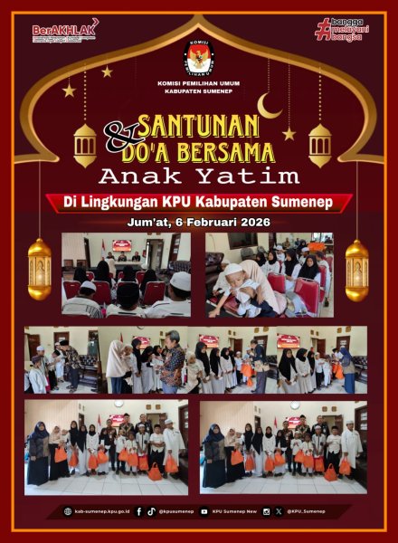 Sumenep, kab-sumenep.kpu.go.id - Menindaklanjuti surat Komisi Pemilihan Umum Republik Indonesia no 303 perihal Santunan Anak Yatim di Lingkungan KPU. Komisi Pemilihan Umum (KPU) Kabupaten Sumenep mengadakan Santunan dan Doa Bersama Anak Yatim di Lingkungan KPU Kabupaten Sumenep. Bertempat di Aula KPU Kabupaten Sumenep pada Jum'at, 6 Februari 2026. Adapun yang mengikuti kegiatan kali ini yaitu Anggota KPU Kabupaten Sumenep Mukhlis Divisi Sosdiklih, Parmas, dan SDM, Dedeng Haryanto Sekretaris KPU Kabupaten Sumenep, Saleh Kasubag Sosdiklih, Parmas, dan SDM, Fibrie Tjahjatri Kasubbag Teknis Penyelenggaraan dan Hukum, beserta Staf KPU Kabupaten Sumenep. Anak Yatim yang hadir berasal dari Panti Asuhan Amanah Umat yang beralamat di Jl. Slamet Riyadi, No.41B, Rt: 02, Rw: 02, Kec. Kota, Bereksosok, Pabian, Sumenep. Kegiatan dimulai dengan sambutan dan pembacaan Surah Yasin dan Doa Bersama oleh Mukhlis Divisi Sosdiklih, Parmas, dan SDM. Muhlis menyampaikan terimakasih yang sebesar-besarnya kepada anak-anak dan pendamping yang berkenan meluangkan waktu untuk hadir di acara ini. Selanjutnya yaitu penyerahan bingkisan beserta santunan dan diakhiri dengan sesi foto bersama Anak Yatim, Anggota KPU Kabupaten Sumenep, Sekretaris KPU Kabupaten Sumenep, Kasubag Sosdiklih, Parmas, dan SDM, dan Kasubbag Teknis Penyelenggaraan dan Hukum KPU Kabupaten Sumenep. (Kontributor : Hani / Editor : Muhlis & Saleh / Dokumentasi : Dadang) ....