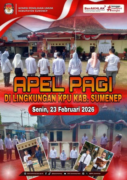 Sumenep, kab-sumenep.kpu.go.id - Komisi Pemilihan Umum Kabupaten Sumenep melaksankan kegiatan apel pagi di halaman KPU Kab. Sumenep, Jl. Raya Gapura, Pamolokan, Kec. Kota, Sumenep. Kegiatan tersebut merupakan acara rutin yang digelar oleh KPU kabupaten Sumenep setiap hari Senin pagi. Apel dimulai pukul 07.30 tersebut berjalan dengan tertib dan khidmat (09/02/2026). Kegiatan apel ini diikuti oleh seluruh jajaran kesekretariatan KPU Kabupaten Sumenep. Kuswandi selaku Kasubbag Rendatin Komisi Pemilihan Umum Kabupaten Sumenep bertindak sebagai Pembina Apel. Apel pagi rutin ini diharapkan dapat terus menjadi wadah untuk menyamakan persepsi, memperkuat koordinasi, kekompakan, dan meningkatkan semangat kerja seluruh jajaran KPU Kabupaten Sumenep. Kegiatan apel diikuti oleh Sekretaris, Kasubbag, beserta Staf. (Kontributor : Hani / Editor: Saleh / Dokumentasi : Dadang) ....