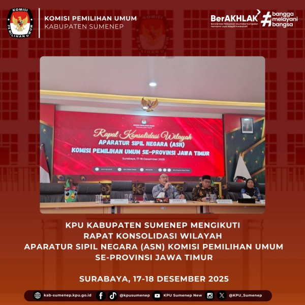 Surabaya,kab-sumenep.kpu.go.id – Berdasarkan Surat Komisi Pemilihan Umum Provinsi Jawa Timur no 1235 tahun 2025. Komisi Pemilihan Umum Kabupaten Sumenep mengikuti kegiatan Rapat Konsolidasi Wilayah ASN KPU se-Jawa Timur pada Rabu, 17 Desember 2025 - Kamis, 18 Desember 2025 di KPU Provinsi Jawa Timur, Jalan Raya Tenggilis No. 1-3, Surabaya. Pada kegiatan hari pertama ini, acara diawali dengan menyanyikan Lagu Indonesia Raya, kemudian pembacaan do'a, selanjutnya pemaparan Laporan Pelaksanaan Kegiatan. Acara dibuka oleh Miftahul Rozaq selaku Ketua Divisi Perencanaan dan Logistik KPU Provinsi Jawa Timur.  "Harus saling support terhadap akuntabilitas kinerja pada instansi kita, selalu support kegiatan dalam setiap subbagian" ujar Miftahul Rozaq. Selanjutnya yaitu pengarahan dari Nanik Karsini selaku Sekretaris KPU Provinsi Jawa Timur. Dalam pengarahannya Nanik menyampaikan apresiasi atas dedikasi, sinergi, dan kolaborasi antar para ASN dalam menyukseskan Pemilu dan Pilkada Serentak 2024 dan berharap melalui momentum ini dapat memantapkan kesiapan KPU Jatim sebagai penyelenggara pemilu yang professional dan berintegritas. Acara ditutup dengan pemaparan materi oleh Kepala Bagian KPU Provinsi Jawa Timur. Acara dihadiri oleh seluruh kepala subbagian KPU Kabupaten Sumenep, yaitu Kasubbag Perencanaan, Data, dan Informasi, Kuswandi; Kasubbag Teknis Penyelenggaraan Pemilu dan Hukum, Fibrie Tjahjatri; Kasubbag Sosdiklih, Parmas, dan SDM, Saleh; dan Kasubbag Keuangan, Umum, dan Logistik, Mustafa Luthfi. (Kontributor : Hani , Editor : Saleh, Dokumentasi : Mustafa Luthfi)