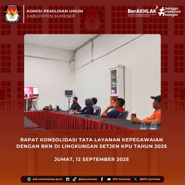 Sumenep, kab-sumenep.kpu.go.id - Komisi Pemilihan Umum Kabupaten Sumenep mengikuti Rapat Konsolidasi Tata Layanan Kepegawaian dengan BKN di Lingkungan Setjen KPU Tahun 2025. Dilaksanakan pada Jumat, 12 September 2025 - Sabtu, 13 September 2025 secara daring melalui media Zoom Meeting.