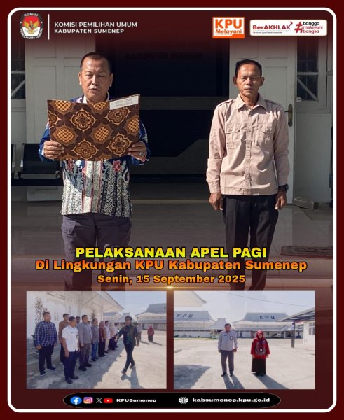 Sumenep, kab-sumenep.kpu.go.id - Komisi Pemilihan Umum Kabupaten Sumenep melaksankan kegiatan apel pagi di halaman KPU Kab. Sumenep, Jl. Asta Tinggi No. 99 Kebonagung, Sumenep. Kegiatan tersebut merupakan acara rutin yang digelar oleh KPU kabupaten Sumenep setiap hari Senin pagi. Apel dimulai pukul 07.30 tersebut berjalan dengan tertib dan khidmat (15/9/2025).
