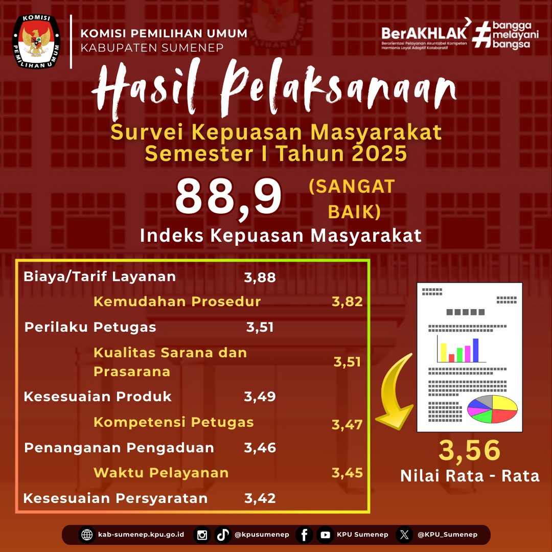 Sumenep, kab-sumenep.kpu.go.id - KPU Kabupaten Sumenep memperoleh Skor Indeks Kepuasan Masyarakat 88,9 kategori Sangat Baik, berdasarkan Survei yang telah dilakukan pada Semester I Tahun 2025.