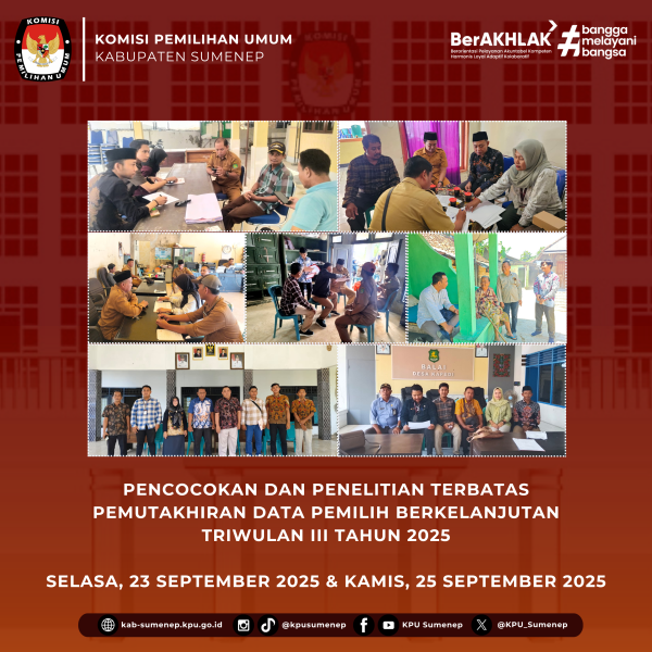 Sumenep, kab-sumenep.kpu.go.id - Komisi Pemilihan Umum Kabupaten Sumenep melaksanakan Pencocokan dan Penelitian Terbatas Pemutakhiran Data Pemilih Berkelanjutan Triwulan III Tahun 2025. Dilaksanakan pada Selasa, 23 September 2025 dan Kamis, 25 September 2025 di masing-masing kecamatan sesuai tim yang telah dibentuk sebelumnya.