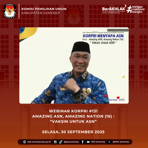 Sumenep, kab-sumenep.kpu.go.id - Komisi Pemilihan Umum Kabupaten Sumenep mengikuti Webinar #131 Korpri Menyapa ASN dengan tema "Amazing ASN, Amazing Nation (16) : "Vaksin untuk ASN" " yang dilaksanakan secara daring melalui Zoom Meeting oleh Dewan Pengurus KORPRI Nasional pada Selasa, 30 September 2025.