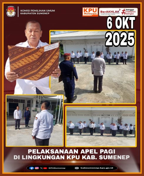 Sumenep, kab-sumenep.kpu.go.id - Komisi Pemilihan Umum Kabupaten Sumenep melaksankan kegiatan apel pagi di halaman KPU Kab. Sumenep, Jl. Asta Tinggi No. 99 Kebonagung, Sumenep. Kegiatan tersebut merupakan acara rutin yang digelar oleh KPU kabupaten Sumenep setiap hari Senin pagi. Apel dimulai pukul 07.30 tersebut berjalan dengan tertib dan khidmat (06/10/2025).