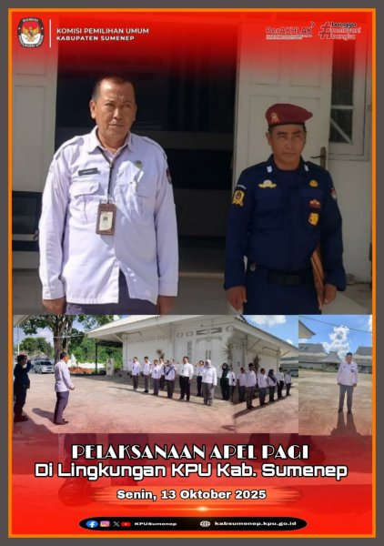 Sumenep, kab-sumenep.kpu.go.id - Komisi Pemilihan Umum Kabupaten Sumenep melaksankan kegiatan apel pagi di halaman KPU Kab. Sumenep, Jl. Asta Tinggi No. 99 Kebonagung, Sumenep. Kegiatan tersebut merupakan acara rutin yang digelar oleh KPU kabupaten Sumenep setiap hari Senin pagi. Apel dimulai pukul 07.30 tersebut berjalan dengan tertib dan khidmat (13/10/2025).