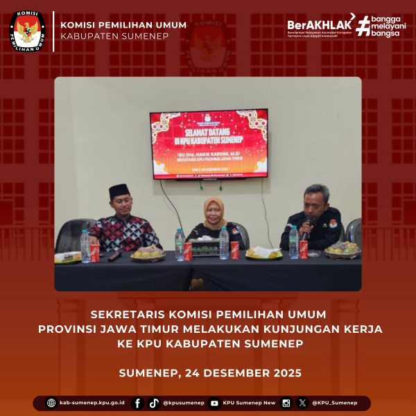 Sumenep, kab-sumenep.kpu.go.id - Menyambut akhir tahun 2025, Nanik Karsini, Sekretaris Komisi Pemilihan Umum Provinsi Jawa Timur melakukan kunjungan kerja ke Komisi Pemilihan Umum Kabupaten Sumenep pada Rabu, 24 Desember 2025.