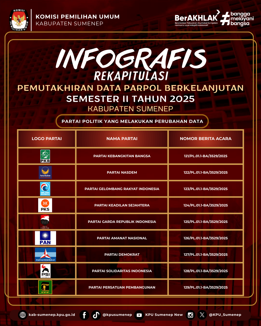 Berdasarkan pengumuman nomor 01/PL.01.1-Pu/3529/2026 disampaikan Hasil Pemutakhiran Data dan Dokumen Partai Politik secara Berkelanjutan melalui SIPOL Semester 2 Tahun 2025, berikut Partai Politik yang melakukan perubahan data :
