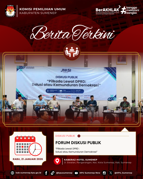 Sumenep, kab-sumenep.kpu.go.id - Komisi Pemilihan Umum Kabupaten Sumenep menghadiri Forum Diskusi Publik dengan tema "Pilkada Lewat DPRD : Solusi atau Kemunduran Demokrasi" yang diadakan oleh Jaringan Media Siber Indonesia JMSI Sumenep pada Rabu, 21 Januari 2026 di Kaberaz Hotel Sumenep, Jl. Siwalan, Pangarangan, Kec. Kota Sumenep, Kab. Sumenep.
