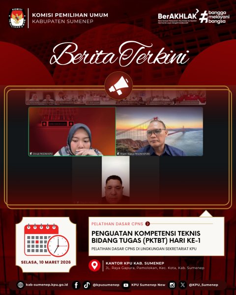 Sumenep, kab-sumenep.kpu.go.id - Berdasarkan Surat Komisi Pemilihan Umum Republik Indonesia no 549 tahun 2026. Komisi Pemilihan Umum Kabupaten Sumenep mengikuti kegiatan Penguatan Kompetensi Teknis Bidang Tugas Pelatihan Dasar CPNS di Lingkungan Sekretariat KPU Provinsi/KIP Aceh dan KPU/KIP Kabupaten/Kota Tahun 2026 pada Selasa, 10 Maret 2026 secara daring melalui Zoom Meeting.