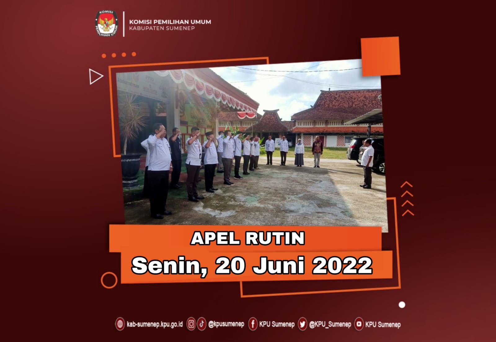 SUMENEP, Kab-sumenep.kpu.go.id. Apel pagi merupakan fungsi Sebagai Sarana Disiplin Dan Tanggung Jawab Pegawai, khususnya di lingkungan Komisi Pemilihan Umum Kabupaten Sumenep. Apel pagi merupakan bagian kewajiban bagi setiap pegawai, selain untuk mendengar arahan pimpinan, apel pagi juga bermanfaat untuk melatih kedisiplinan dan tanggung jawab bagi setiap pegawai. (Senin, 20 Juni 2022).