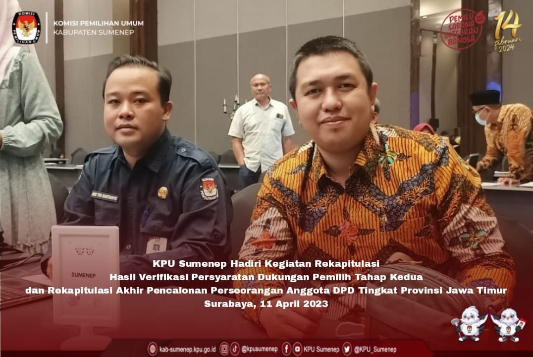 Surabaya,kab-sumenep.kpu.go.id-. Komisi Pemilihan Umum (KPU) Kabupaten Sumenep menghadiri Kegiatan Rekapitulasi Verifikasi Persyaratan Dukungan Pemilih Tahap Kedua dan Rekapitulasi Akhir Pencalonan Perseorangan Anggota Dewan Perwakilan daerah Tingkat Provinsi Jawa Timur bertempat di salah satu hotel di Surabaya. Selasa (11 April 2023)