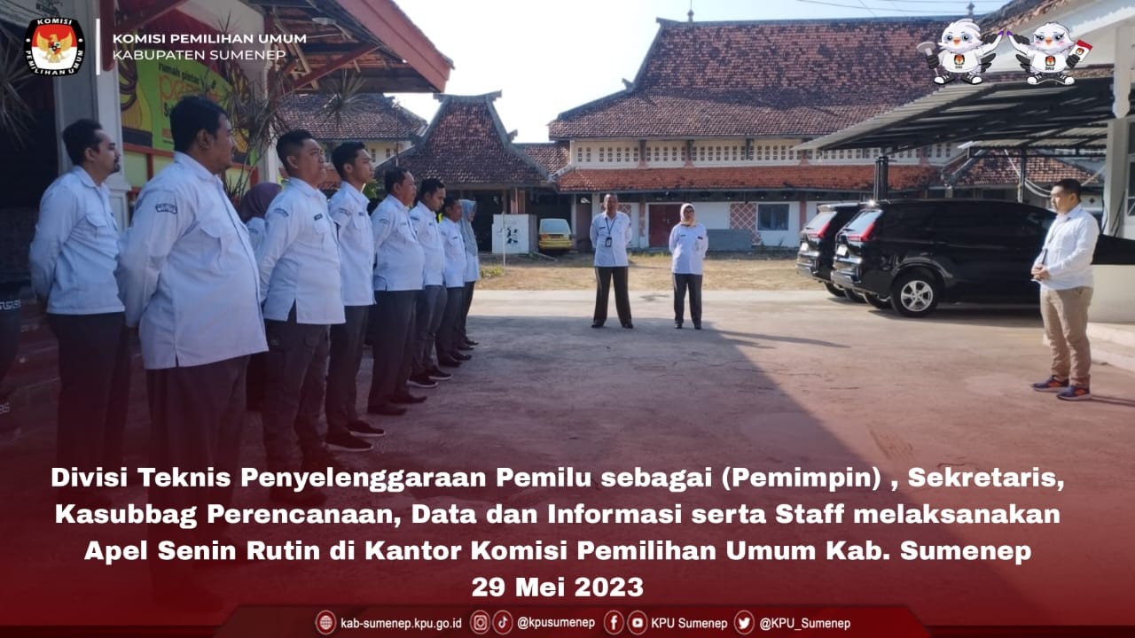 Sumenep,kab-sumenep.kpu.go.id-. Kegiatan rutin apel senin pagi yang dilaksanakan oleh Komisi Pemilihan Umum (KPU) Kabupaten Sumenep kali ini dipimpin oleh Komisioner KPU Kabupaten Sumenep Divisi Teknis Deki Prasetia Utama. Senin (29 Mei 2023).