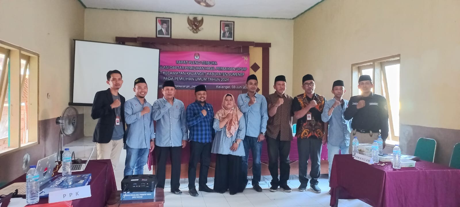 Sumenep,kab-sumenep.kpu.go.id-. Menindaklanjuti Keputusan KPU Nomor 27 Tahun 2023, Tentang pedoman teknis penyusunan Daftar Pemilih Dalam Negeri pada Penyelenggaraan Pemilu 2024, Panitia Pemilihan Kecamatan Kalianget menggelar Rapat Pleno Rekapitulasi DPSHP Akhir di Tingkat Kecamatan bertempat di Aula kantor kecamatan Kalianget. Hadir dalam kegiatan kali ini diantaranya Camat Kalianget, Kapolsek Kalianget, Danramil Kalianget, Panwascam Kalianget, perwakilan Parpol di tingkat kecamatan, serta seluruh PPS di diwilayah kalianget serta Rafiqi, anggota KPU Kabupaten sumenep Divisi SDM dan Parmas. Sabtu (3 Juni 2023).