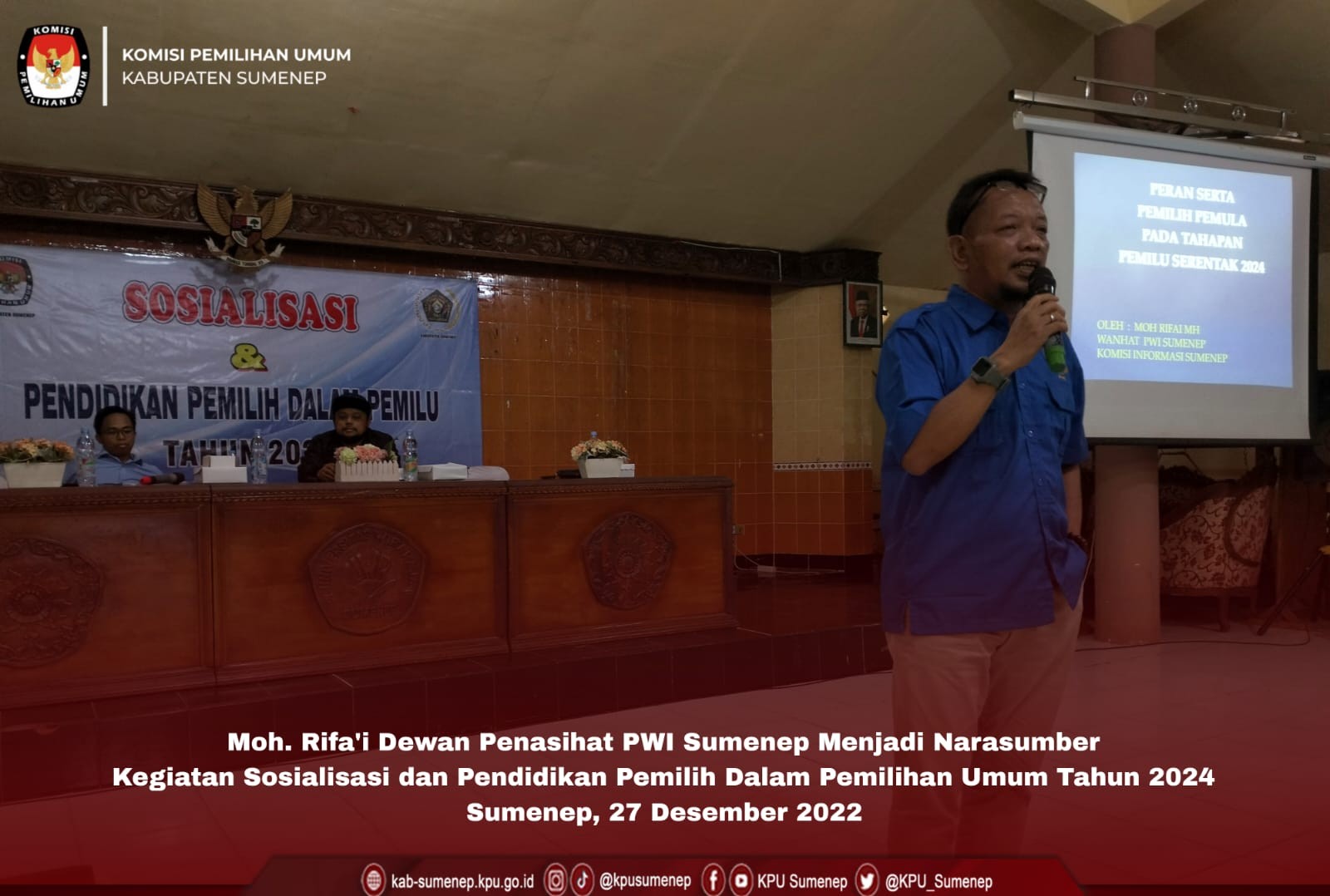 Sumenep, kab-sumenep.kpu.go.id-. Menggandeng Persatuan Wartawan Indonesia (PWI) salah satu organisasi media yang ada di Sumenep, Komisi Pemilihan Umum Kabupaten Sumenep melaksanakan sosialisasi dan pendidikan pemilih dalam Pemilu tahun 2024 yang bertempat di aula Graha Sumekar Unija Sumenep. Selasa (27 Desember 2022).