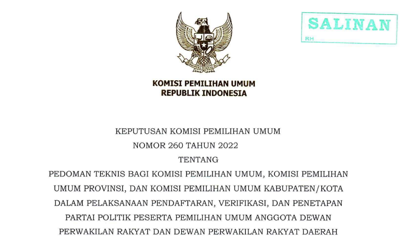 Jakarta, jdih.kpu.go.id - Komisi Pemilihan Umum Republik Indonesia telah menerbitkan Keputusan Komisi Pemilihan Umum Nomor 260 Tahun 2022 tentang Pedoman Teknis Bagi Komisi Pemilihan Umum, Komisi Pemilihan Umum Provinsi, dan Komisi Pemilihan Umum Kabupaten/Kota Dalam Pelaksanaan Pendaftaran, Verifikasi, dan Penetapan Partai Politik Peserta Pemilihan Umum Anggota Dewan Perwakilan Rakyat dan Dewan Perwakilan Rakyat Daerah. <<KLIK DISINI>>
