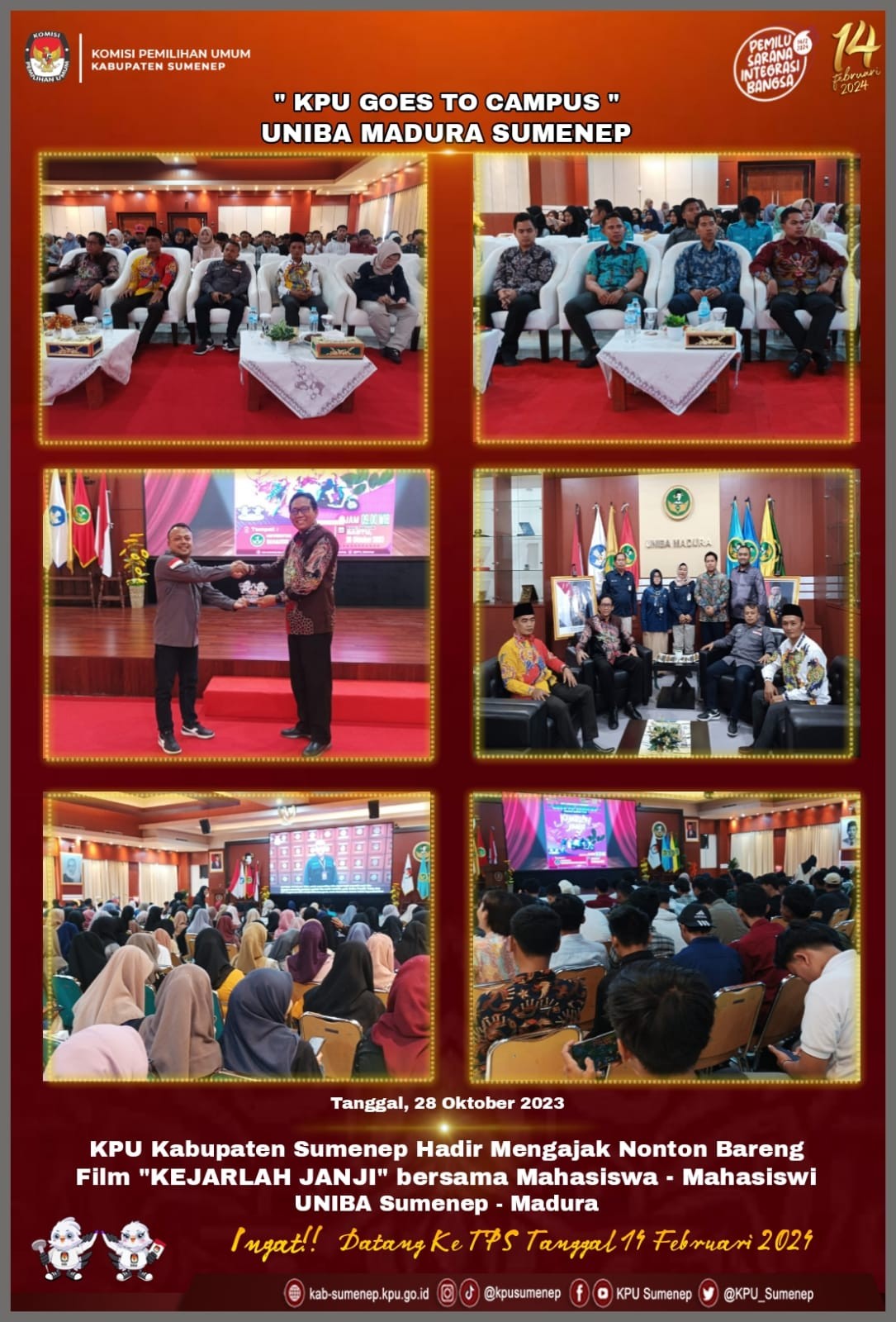 Sumenep,kab-sumenep.kpu.go.id-. Kegiatan Nonton bareng tidak hanya dilaksanakan di Pondok Pesantren seperti yang beberapa waktu telah dilaksanakan di salah satu pondok pesantren yang ada di wilayah kecamatan kota Sumenep. Kali ini bersamaan dengan memperingati hari Sumpah Pemuda, Komisi Pemilihan Umum Kabupaten Sumenep melaksanakan kegiatan “KPU Goes to Campus” dengan agenda nonton bareng film “kejarlah janji” yang dilaksanakan di universitas Bahaudin Mudhary Sumenep. Sabtu, (28 Oktober 2024).