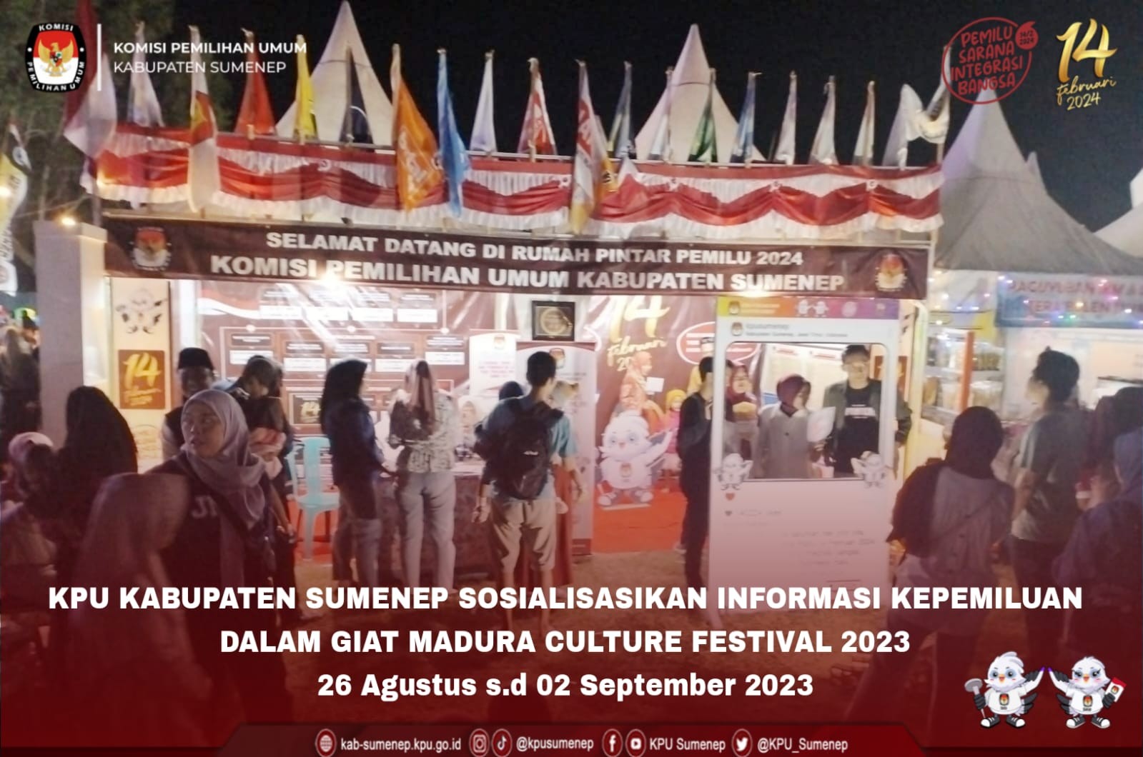 Sumenep,kab-sumenep.kpu.go.id-. Pemerintah Kabupaten Sumenep menyelenggarakan event Madura Culture Festival. Komisi Pemilihan Umum turut berpartisipasi dalam agenda kali ini dengan membuka stand Rumah Pintar pemilu 2024. Kegiatan ini akan berlangsung sejak hari ini 26 Agustus 2023 sampai dengan 2 September 2024 yang bertempat di stadion Panglegur Sumenep. Sabtu, ( 26 Agustus 2023).