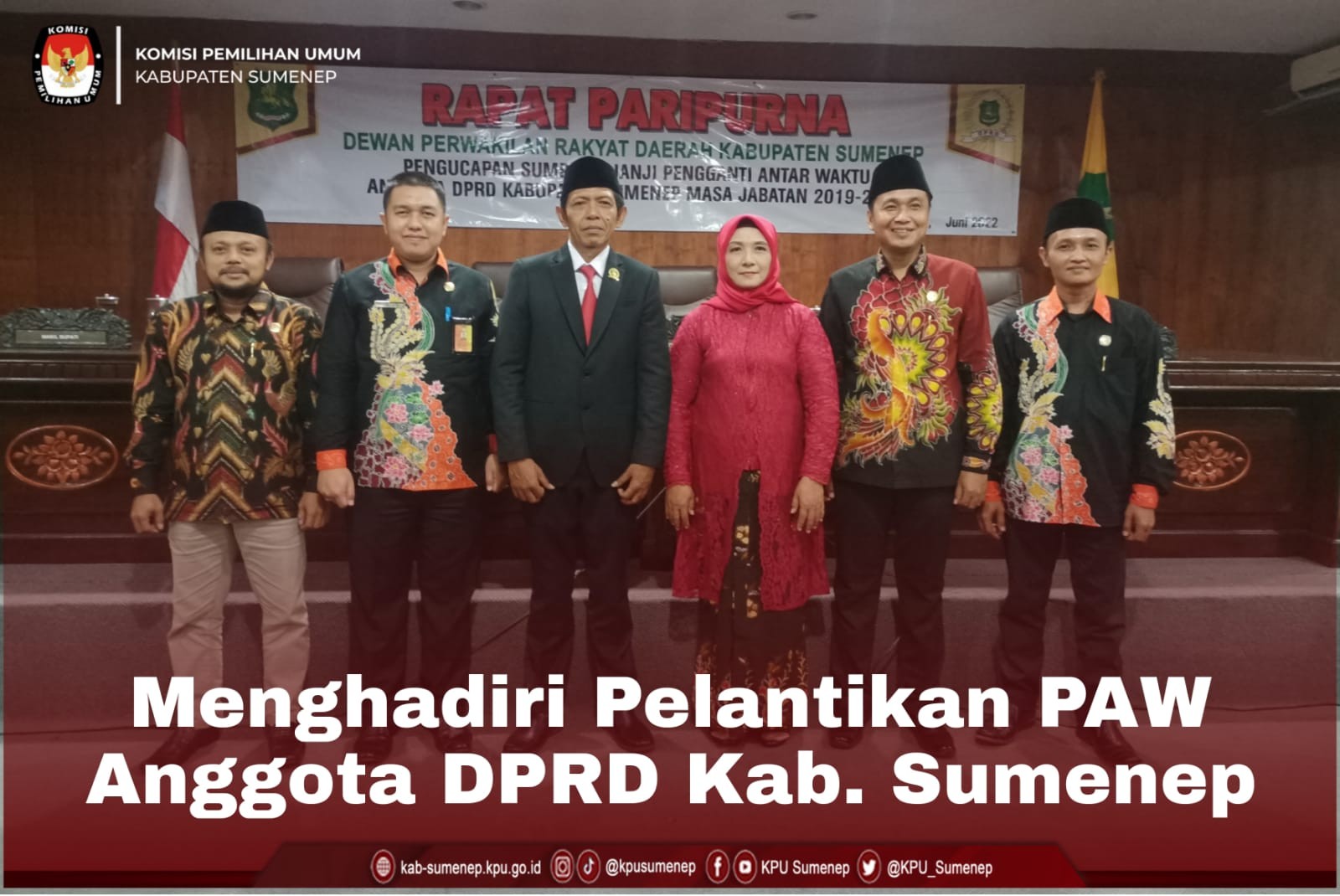 SUMENEP, Kab-sumenep.kpu.go.id. Setelah menyelesaikan proses Pengganti Antar Waktu (PAW) dari dua partai politik yang mengajukan PAW yaitu Partai Persatuan Pembangunan (PPP) dan Partai Demokrasi Indonesia Perjuangan (PDI-P). Komisi Pemilihan Umum (KPU) Sumenep menghadiri undangan pelantikan aggota dewan hasil PAW bertempat di ruang rapat gedung Dewan Perwakilan Rakyat Daerah (DPRD) Labupaten Sumenep. (senin, 27 Juni 2022).