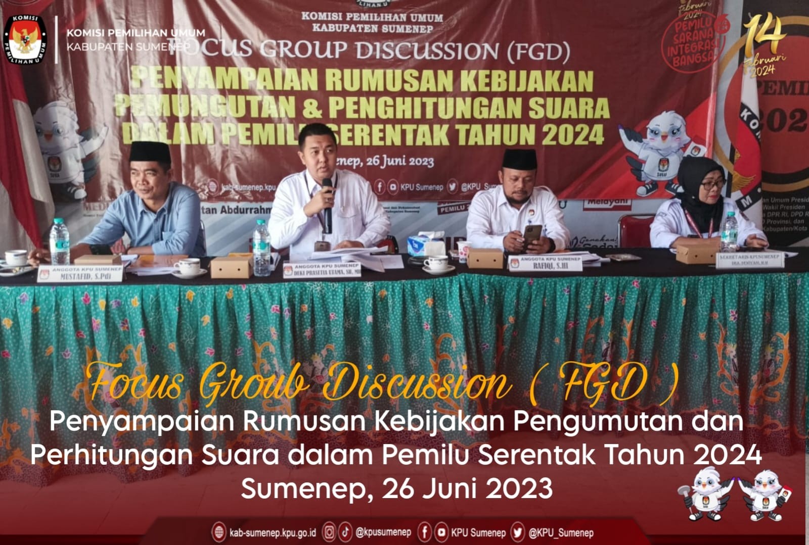 Sumenep,kab-sumenep.kpu.go.id-. Menindaklanjuti surat Komisi Pemilihan Umum (KPU) RI perihal penyiapan rumusan kebijakan pemungutan dan penghitungan suara dalam pemilu serentak tahun 2024, KPU Kabupaten Sumenep mengundang ketua partai politik serta LSM yang konsen di bidang kepemiluan melaksanakan Focus Group Discussion (FGD) yang bertempat di ruang aula ruang rapat kantor KPU Kabupaten Sumenep. Senin (26 Juni 2023).