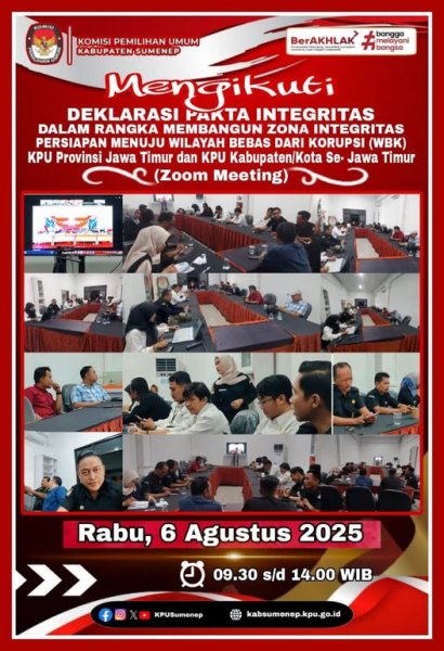 Sumenep, kab-sumenep.kpu.go.id - Komisi Pemilihan Umum Kabupaten Sumenep mengikuti Deklarasi Pakta Integritas dalam Rangka Pembangunan Zona Integritas Persiapan Menuju Wilayah Bebas dari Korupsi (WBK) . Dilaksanakan pada Rabu, 6 Agustus 2025 secara daring melalui media Zoom Meeting.