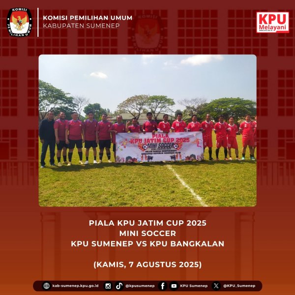 Sumenep, kab-sumenep.kpu.go.id - Komisi Pemilihan Umum (KPU) Kabupaten Sumenep mengikuti pertandingan Mini Soccer yang diselenggarakan oleh Komisi Pemilihan Umum (KPU) Provinsi Jawa Timur dalam rangka memeriahkan peringatan HUT Republik Indonesia ke-80. Bertempat di Lapangan Sadandang, Jl. Agus Salim, Kabupaten Pamekasan, pada Kamis (7/8/2025). Kegiatan ini menjadi sarana silaturahmi sekaligus memperkuat sinergi antar satuan kerja di lingkungan Komisi Pemilihan Umum.