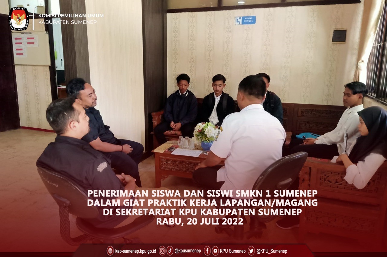 SUMENEP, Kab-sumenep.kpu.go.id. Seperti kantor/instansi pada umumnya, Komisi Pemilihan Umum Kabupaten Sumenep hampir setiap tahun menerima magang adik adik dari tingkat SMK. Kali ini ada 5 orang siswa/i yang berkesempatan untuk melakukan magang. Kelima siswa/i tersebut diantar langsung oleh guru pembimbing nya langsung. (Rabu 20 Juli 2022).