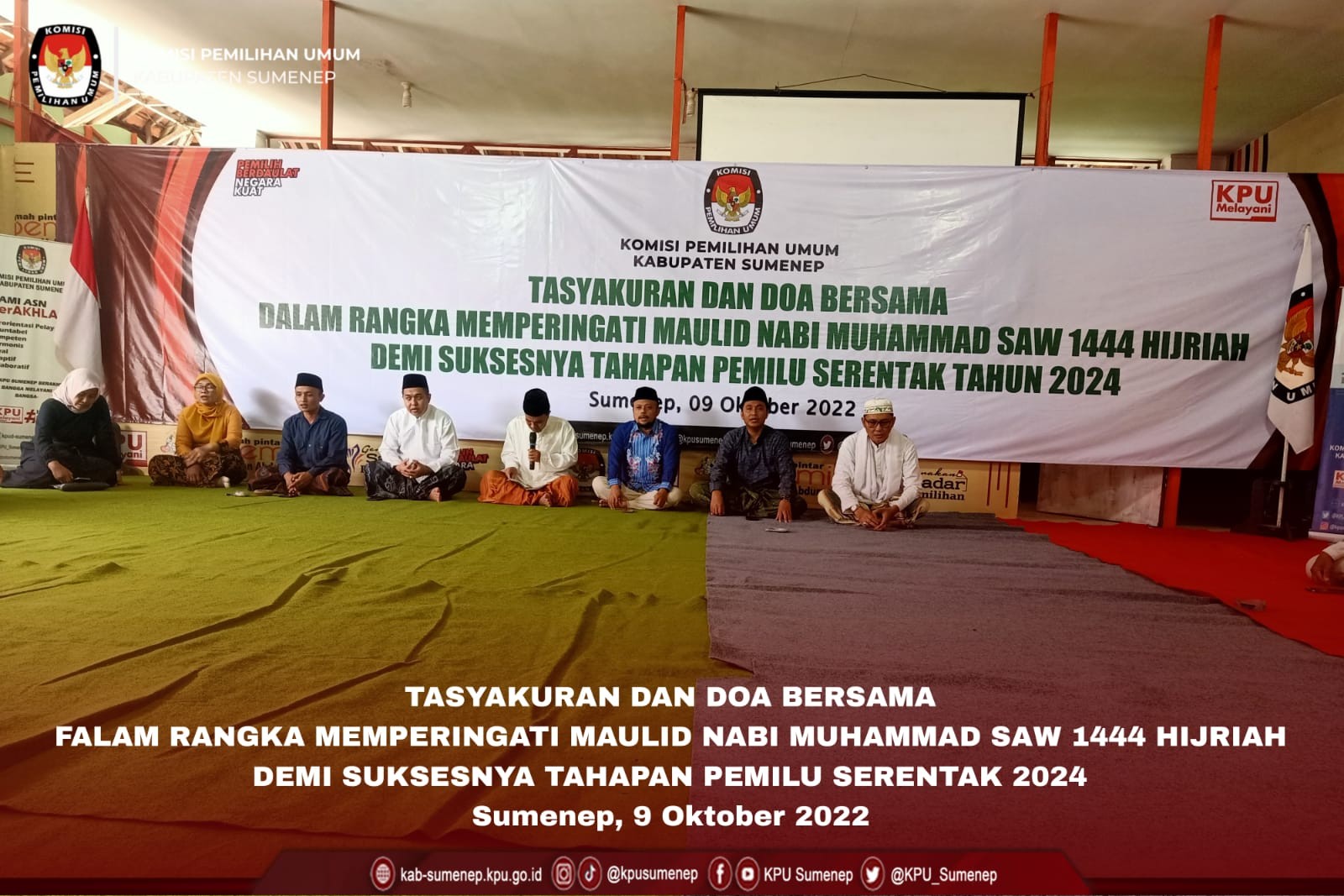 Kegiatan kali ini dalam rangka tasyakuran dan doa bersama dalam rangka memperingati Maulid Nabi Muhammad SAW 1444 H yang diselenggarakan oleh KPU Sumenep. Acara diawali dengan pembacaan kalam Ilahi dan dilanjutkan dengan doa bersama yang dipimpin oleh tokoh agama setempat.