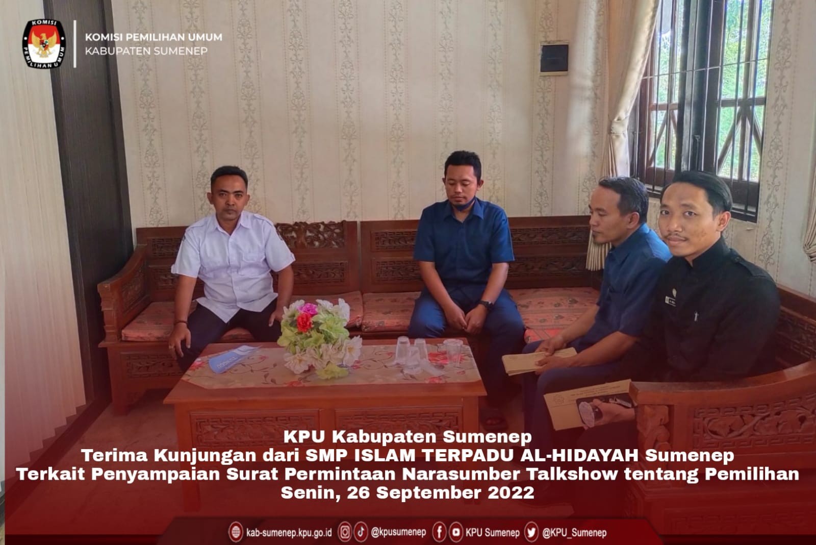 Sumenep, kab-sumenep.kpu.go.id-. Pendidikan terkait kepemiluan atau demokrasi memang sebaiknya perlu diperkenalkan sejak dini. Guna mendukung kegitan tersebut, SMP ISLAM TERPADU AL-HIDAYAH Sumenep berkunjung ke kantor Komisi Pemilihan Umum Kabupaten Sumenep.Tujuan dari kunjungan kali ini adalah sebagai bentuk silaturahmi pihak yayasan kepada KPU Kabupaten Sumenep. (Senin, 26 September 2022).