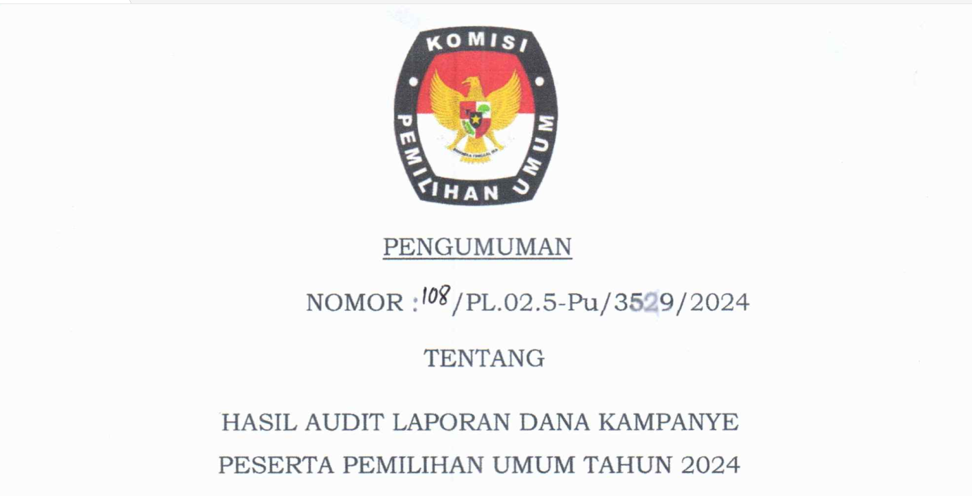 Pengumuman Hasil Audit Dana Kampanye Pemilu Serentak 2024 Senin, 08 April 2024 07:00 142 Pengumuman Hasil Audit Dana Kampanye (Klik Disini) Bagikan: Telah dilihat 142 kali