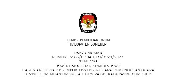 PENGUMUMAN HASIL PENELITIAN ADMINISTRASI CALON ANGGOTA KELOMPOK PENYELENGGARA PEMUNGUTAN SUARA UNTUK PEMILIHAN UMUM TAHUN 2024 SE- KABUPATEN SUMENEP