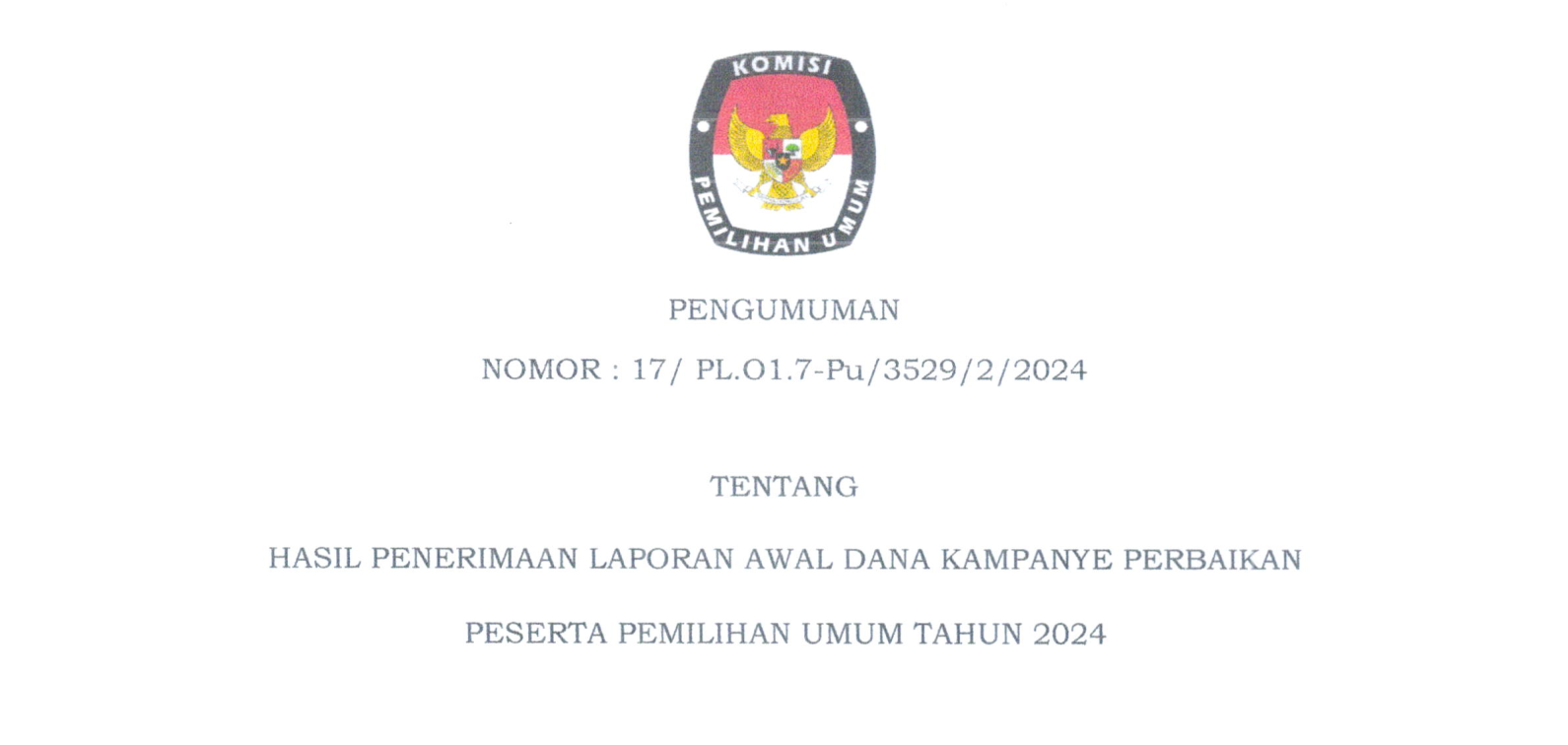 Pengumuman Hasil Penerimaan Laporan Awal Dana Kampanye Perbaikan Peserta Pemilu Tahun 2024 Sabtu, 13 Januari 2024 06:27 217 (Klik Disini >>>>Pengumuman LADK Hasil Perbaikan Bagikan: Telah dilihat 217 kali