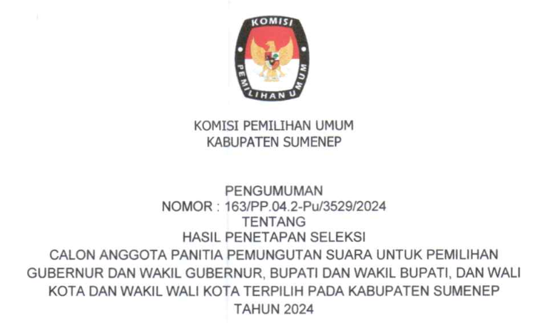 Pengumuman Hasil Penetapan Seleksi Calon Anggota Panitia Pemungutan Suara Untuk Pemilihan Gubernur dan Wakil Gubernur serta Bupati dan Wakil Bupati Terpilih Pada Kabupaten Sumenep Tahun 2024 Jumat, 24 Mei 2024 20:22 1134 Pengumuman Hasil Penetapan Seleksi Calon Anggota Panitia Pemungutan Suara Untuk Pemilihan Gubernur dan Wakil Gubernur serta Bupati dan Wakil Bupati Terpilih Pada Kabupaten Sumenep Tahun 2024 (Klik Disini) Bagikan: Telah dilihat 1,134 kali