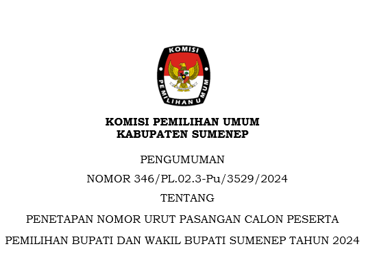 PENGUMUMAN PENETAPAN NOMOR URUT PASANGAN CALON PESERTA PEMILIHAN BUPATI DAN WAKIL BUPATI SUMENEP TAHUN 2024