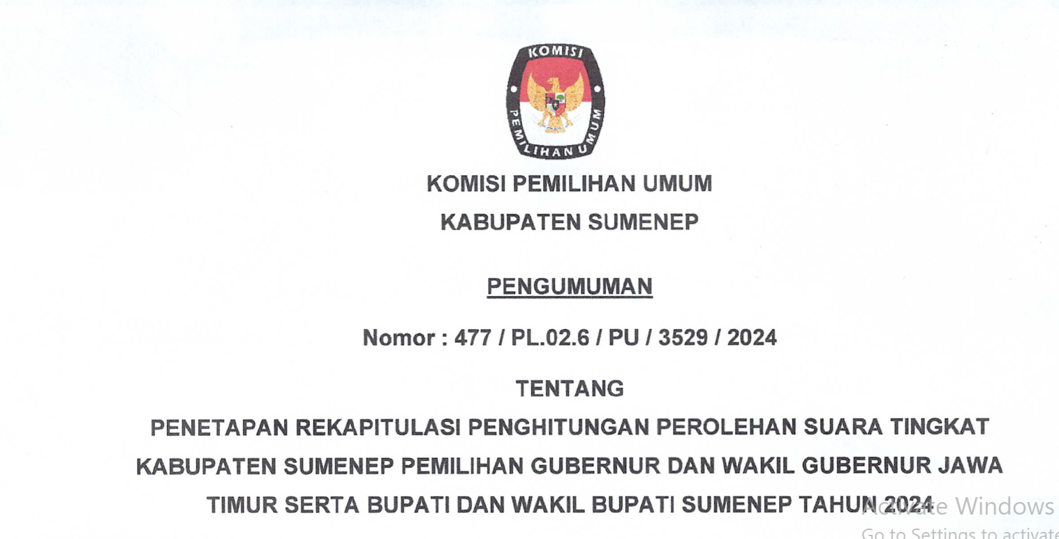 PENGUMUMAN PENETAPAN REKAPITULASI PENGHITUNGAN PEROLEHAN SUARA TINGKAT KABUPATEN SUMENEP PEMILIHAN GUBERNUR DAN WAKIL GUBERNUR JAWA TIMUR SERTA BUPATI DAN WAKIL BUPATI SUMENEP TAHUN 2024