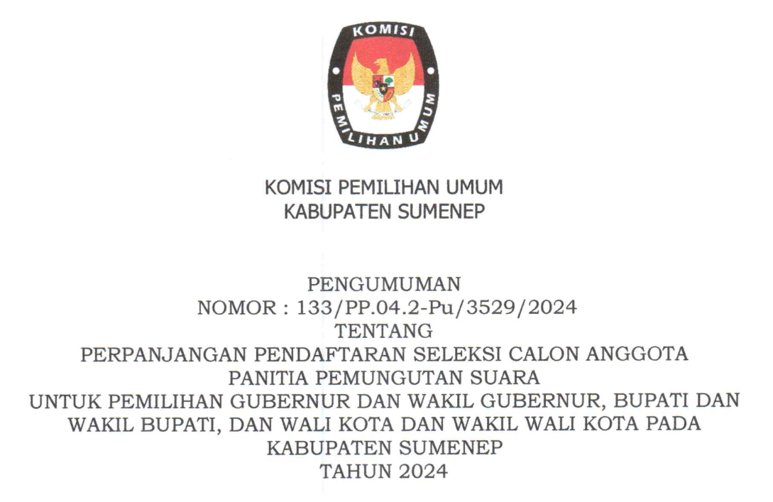 Pengumuman Perpanjangan Pendaftaran Seleksi Calon Anggota Panitia Pemungutan Suara Untuk Kabupaten Sumenep Tahun 2024 Kamis, 09 Mei 2024 07:00 803 Pengumuman Perpanjangan Pendaftaran Seleksi Calon Anggota Panitia Pemungutan Suara Untuk Pemilihan Gubernur dan Wakil Gubernur, Bupati dan Wakil Bupati, dan Walikota dan Wakil Walikota Pada Kabupaten Sumenep Tahun 2024 (Klik Disini) Bagikan: Telah dilihat 803 kali