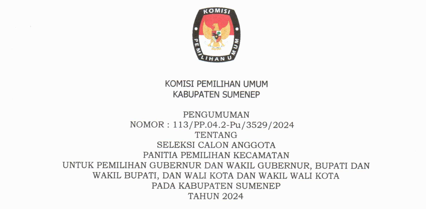 Pengumuman Seleksi Calon Anggota Panitia Pemilihan Kecamatan Untuk Pemilihan Gubernur dan Wakil Gubernur, Bupati dan Wakil Bupati Pada Kabupaten Sumenep Tahun 2024