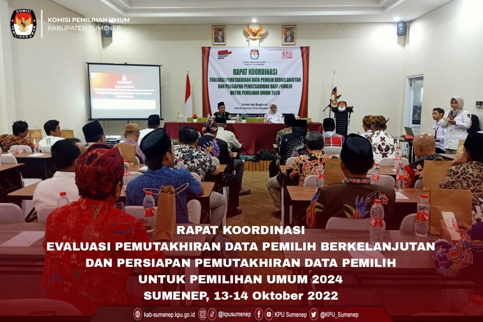 Sumenep,kab-sumenep.kpu.go.id-. Komisi Pemilihan Umum (KPU) Kabupaten Sumenep melaksanakan Rapat Koordinasi Evaluasi Pemutakhiran Data Pemilih Berkelanjutan dan Persiapan Pemutakhiran Data Pemilih Untuk Pemilu tahun 2024. Rencananya acara akan dilangsungkan selama 2 hari, mulai dari tanggal 13 -14 Oktober 2022