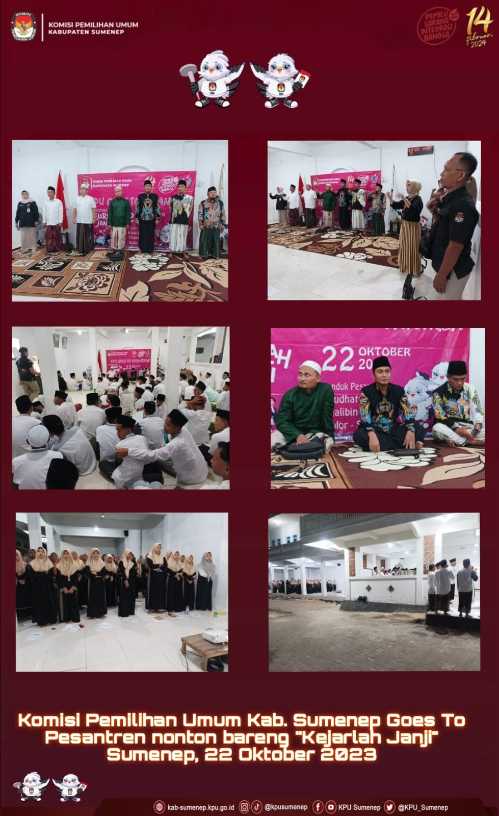 Sumenep,kab-sumenep.kpu.go.id-. Komisi Pemilihan Umum (KPU) Kabupaten Sumenep bekerja sama dengan pondok pesantren Raudhatut Tholibin yang ada di desa, Kolor Kota Sumenep menggelar kegiatan nonton bareng film yang berkaitan dengan Pemilu dengan judul “Kejarlah Janji. Minggu (22/10/2023) pada pukul 17.00 WIB sampai dengan selesai.