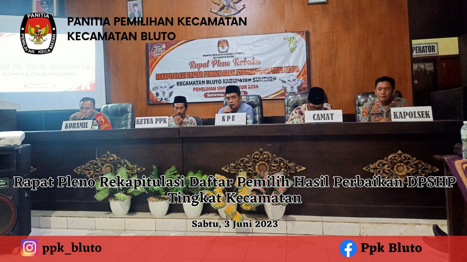 Bluto,kab-sumenep.kpu.go.id-. Panitia Pemilihan Kecamatan (PPK) Bluto laksanakan rapat pleno terbuka Rekapitulasi Daftar Pemilih Hasil Perbaikan DPSHP Akhir untuk Pemilihan Umum (Pemilu) Tahun 2024, Acara dilaksanakan di Pendopo Kecamatan Bluto. Kegiatan ini dihadiri oleh Mustafid, komisioner KPU Sumenep Divisi Hukum, Ketua Panwascam Bluto beserta 2 anggotanya, Camat Bluto, Kapolsek Bluto, Danramil dan utusan partai politik, serta seluruh ketua dan anggota PPS Divisi Data se-Kecamatan Bluto. Minggu (3 Juni 2023).