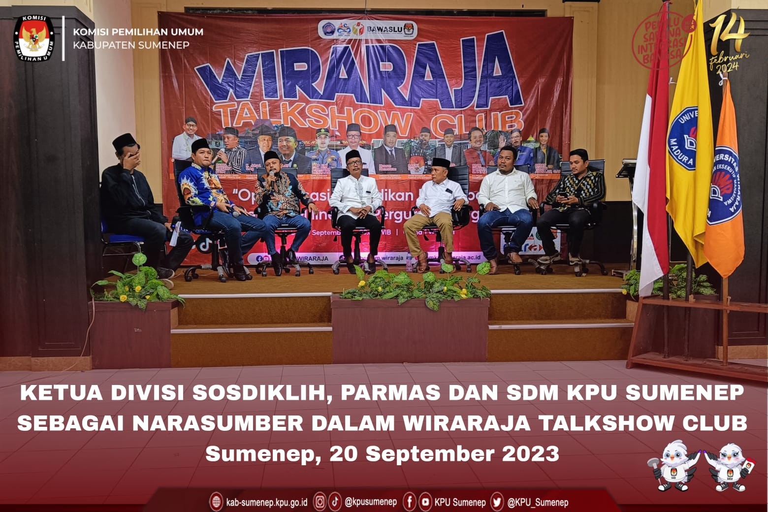 Sumenep,kab-sumenep.kpu.go.id-. Pemilih milenial merupakan jumlah pemilih yang angkanya cukup besar pada perhelatan Pemilu di negara kita. Tentu saja peran mereka dalam meningkatkan partisipasi masyarakat guna meggunakan hak pilihnya sangatlah penting sehingga nantinya bisa tercipta pemilihan yang berkualitas. Kurangnya pemahaan terkait politik maupun pemilu menjadi celah masuknya politik uang di masyarakat. Sehingga untuk meningkatkan minat dan pemahaman mereka tentang Pemilu serta membatasi ruang gerak broker politik, Universitas Wirararaj Sumenep menggelar Talkshow Optimalisasi Club Pendidikan Politik Pada Pemilih Milenial Di Perguruan Tinggi yang dilaksanakan di Gedung pertemuan Univ. Wiraraja Sumenep. Rabu,(20 September 2023).
