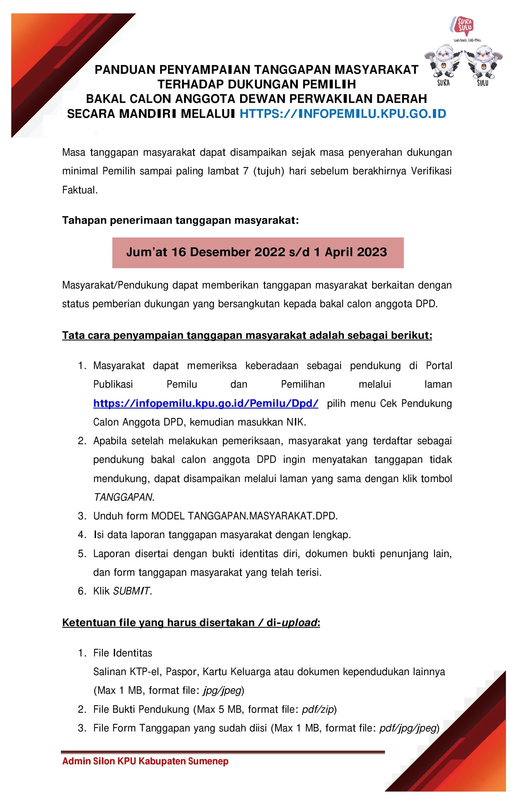 "Masa tanggapan masyarakat dapat disampaikan sejak masa penyerahan dukungan minimal Pemilih sampai paling lambat 7 (tujuh) hari sebelum berakhirnya Verifikasi Faktual yaitu mulai 16 Desember 2022 s/d 1 April 2023", jelas Deki.