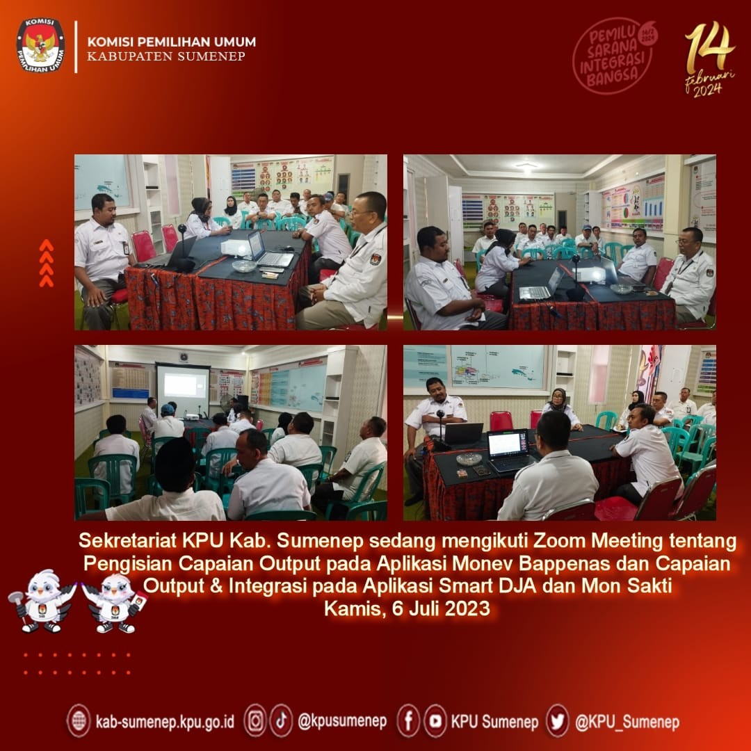 Sumenep,kab-sumenep.kpu.go.id-. Dalam rangka pelaksanaan monitoring atas capaikan kinerja anggaran kementrian/lembaga pada periode Triwulan II tahun 2023, dan berdasarkan Peraturan Pemerintah tahun 2006 tentang Tata Cara Pengendalian dan Evaluasi Pelaksanaan Rencana Pembangunan dan Peraturan menteri Keuangan nomor 22 tahun 2021 tentang Pengukuran dan Evaluasi Kinerja Anggaran atas Pelaksanaan Rencana Kerja dan Anggaran Kememtrian Negara/Lembaga, seluruh staff sekretariat Komisi Pemlihan Umum (KPU) Kabupaten Semenep mengikuti zoom meeting rapat monitoring pelaksanaan kegiatan dan anggaran KPU triwulan II tahun 2023. Kamis (6 Juli 2023).