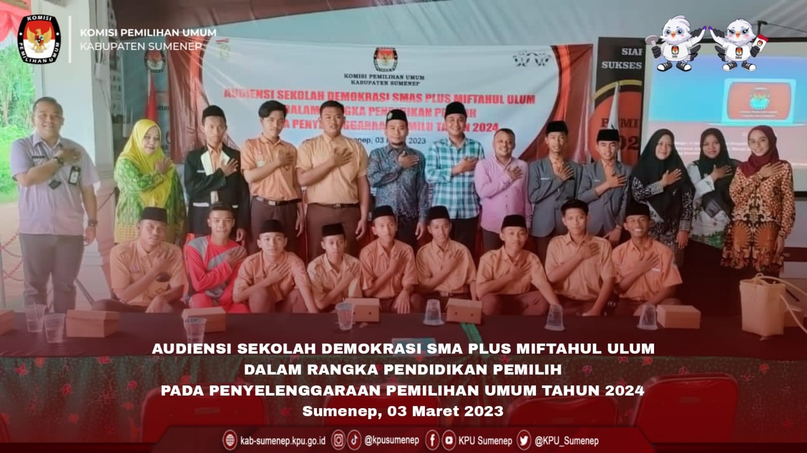 Sumenep,kab-sumenep.kpu.go.id-. Sinergisitas KPU dengan sekolah terus di maksimalkan guna memberikan pendidikan pemilih kepada kaum milenial khususnya pelajar. Kali ini Komisi Pemilihan Umum (KPU) Kabupaten Sumenep kedatangan siswa dari SMA Plus Miftahul Ulum Terate Sumenep yang di dampingi oleh dewan guru pembimbing. Jumat (3 Maret 2023) Audiensi diawali sambutan dari Mulyadi, perwakilan sekolah SMA Plus Miftahul Ulum. Mulyadi menyampaikan terimakasih kepada pihak KPU Kabupaten Sumenep yang memberikan waktu kepada siswa sehingga saat ini siswa bisa menerima pembelajaran langsung terkait demokrasi oleh komisioner KPU Sumenep. “Kegiatan kali ini dalam rangka proyek kurikulum merdeka dengan tema suara demokrasi,” jelas Mulyadi. Dilanjutkan dengan sambutan dari ketua KPU Sumenep, Rahbini. Pertama tama Rahbini menyampaikan terikakasih kepada dewan guru yang memiliki sience of demokrasi sehingga siswa-siswi bisa dikenalkan lebih dini terkait demokrasi secara langsung. Bahwa Pemilu tidak hanya semata mata memilih pemimpin di pemerintahan, akan tetapi juga bisa diterapkan di lingkungan masyarakat maupun di tingkat sekolah dalam hal ini seperti hal nya pemilihan ketua OSIS. “Saya berharap agar ilmu yang didapatkan kali ini nantinya bisa disampaikan kepada teman yang lain, terutama yang sudah memiliki hak pilih pada Pemilu mendatang,” jelas Rahbini. Dilanjutkan dengan sosialisasi oleh Rafiqi, Komisioner KPU Kabupaten Sumenep Divisi Parmas. Pertama tama Rafiqi menyampaikan devinisi dasar terkait demokrasi, pemilih dan partisipasi masyarakat, dasar teoritik demokrasi, makna demokrasi, Pemilu dalam sistem Demokrasi, pemilu dan produk perwakilan, keunggulan demokrasi pancasila, Pelaksanaan Pemilu tahun 2024. “Saat ini tahapan KPU adalah coklit, saya berharap agar semua yang hadir berperan aktif mengawasi dan melaporkan terkait daftar pemilih ini, apabila belum terdata silahkan melaporkan kepada petugas di desa masing-masing” terang Rafiqi. Audiensi kali ini ditutup dengan kunjungan ke ruang peraga dan ruang audio visual RPP Sultan Abdurrahman KPU Sumenep serta penyerahan cinderamata dari SMA Plus Miftahul Ulum kepada KPU Kabupaten Sumenep begitu juga sebaliknya. (Kontributor : Heru/Editor: Adi Tri H / foto: Farid).