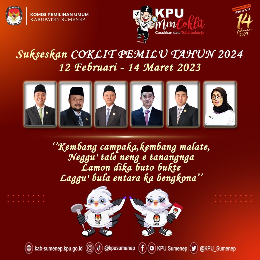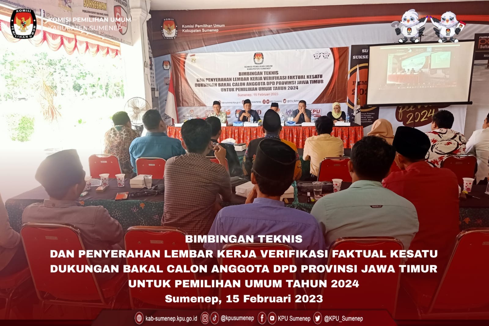 Sumenep, kab-sumenep.kpu.go.id-. Guna menyatukan pemahaman terkait pelaksanaan Verifikasi Faktual (Verfak) Kesatu Dukungan Bakal Calon (Bacalon) Anggota DPD Provinsi Jawa Timur pada Pemilu tahun 2024, Komisi Pemilihan Umum (KPU) Kabupaten Sumenep mengundang anggota Panitia Pemilihan Kecamatan (PPK) Divisi Teknis untuk mengikuti Bimbingan Teknis (Bimtek) dan Penyerahan Lembar Kerja yang nantinya akan digunakan oleh PPS dalam melakukan verifikasi faktua. Rabu (15 Februari 2023). Kegiatan Bimtek dibuka oleh Ketua KPU Kabupaten Sumenep, Rahbini. Pada kesempatan kali ini Rahbini mengajak seluruh PPK untuk terus menjaga integritas serta kekompakan dalam menjalankan tugas. “Pada saat verifikasi parpol beberapa waktu yang lalu semua bisa berjalan dengan lancar, maka saya berharap pada tahapan kali ini juga demikian,” terang Rahbini. Rahbini juga berpesan kepada PPK khususnya Divisi Teknis Penyelenggaraan untuk terus menjalin komunikasi baik dengan semua kalangan, seperti dengan tokoh masyarakat maupun pengawas pada tahapan verifikasi faktual kali ini dan berharap pesan ini juga diturunkan ke teman teman di tingkat PPS. Materi pertama disampaikan dari Bawaslu Kabupaten Sumenep, dalam hal ini disajikan oleh Imam Syafi’i. Imam menyampaikan bahwa Bawaslu Kabupaten sudah melakukan Bimtek kepada Panwascam dan mengintruksikan kepada Pengawas Kecamatan (Panwascam) untuk serius mengawasi tahapan verifikasi faktual dukungan calon anggota DPD kali ini. Imam juga berpesan agar seluruh pihak yang berwenang menjalankan tugas dengan berlandaskan undang-undang dan peraturan yang ada. “ Saya meminta kepada semua pihak agar mempelajari dengan seksama aturan yang ada, baik itu UU, perbawaslu maupun PKPU nya,” harap Imam. Dilanjutkan dengan penyampaian materi oleh anggota KPU Kabupaten Sumenep Divisi Teknis Deki Prasetia Utama. Deki memaparkan regulasi pelaksanaan verifikasi faktual yang diatur dalam UU nomor 7 tahun 2027, Perpu nomor 1 tahun 2017, dan PKPU nomor 10 tahun 2022. Disampaikan oleh Deki bahwa untuk Jawa Timur, jumlah dukungan minimal calong anggota DPD sebanyak 5000. Sedangkan di Kabupaten jumlah pendukung yang harus diverifikasi sejumlah 1643 orang. “terkait sebaran dukungan calon DPD di Kabupaten Sumenep sampai dengan saat ini hanya ada di 23 kecamatan, jadi ada 4 kecamatan yang nantinya tidak melakukan verifikasi faktual,” jelas Deki. Kegiatan Bimtek ditutup dengan pembagian lembar kerja oleh KPU kabupaten Sumenep kepada PPK dan nantinya oleh PPK akan diteruskan kepada PPS dimana sebelum menyerahkan kepada PPS, PPK akan membimtek PPS terlebih dahulu terkait tata cara melakukan verifikasi faktual. (Kontributor : Heru/Editor: Adi Tri H/ foto: Dadang).