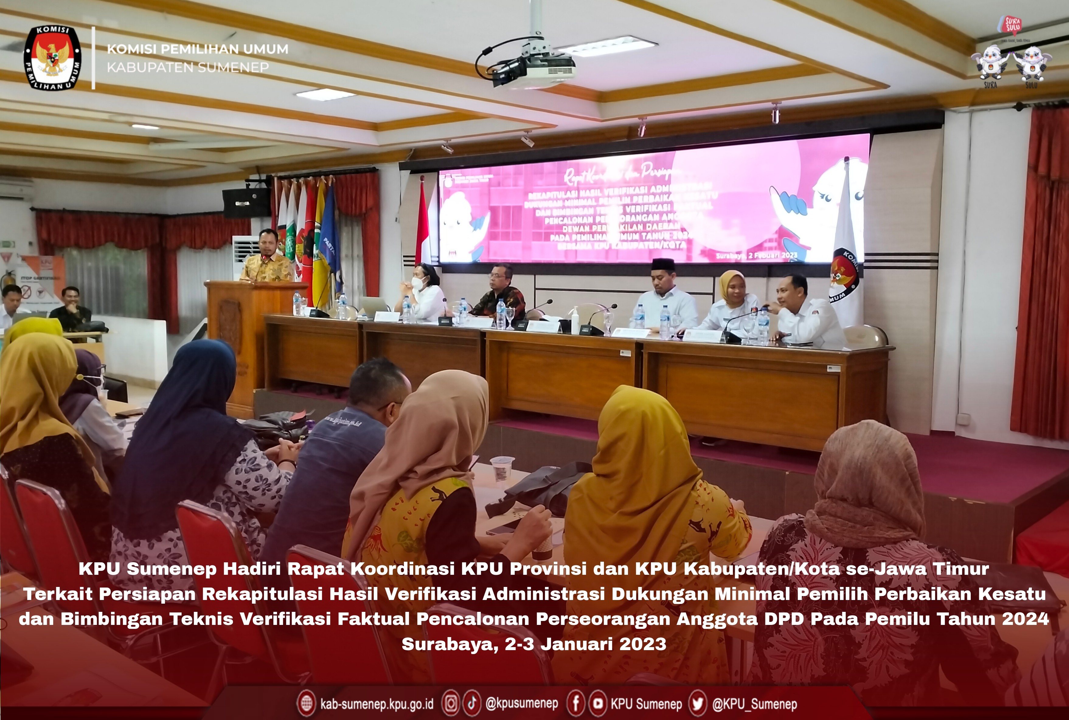 Surabaya, kab-sumenep.kpu.go.id - Pada siang hari ini (Kamis, 2 Februari 2023) hingga esok, KPU Kabupaten Sumenep mengikuti kegiatan Rapat Koordinasi KPU Provinsi dan KPU Kabupaten/Kota se-Jawa Timur.
