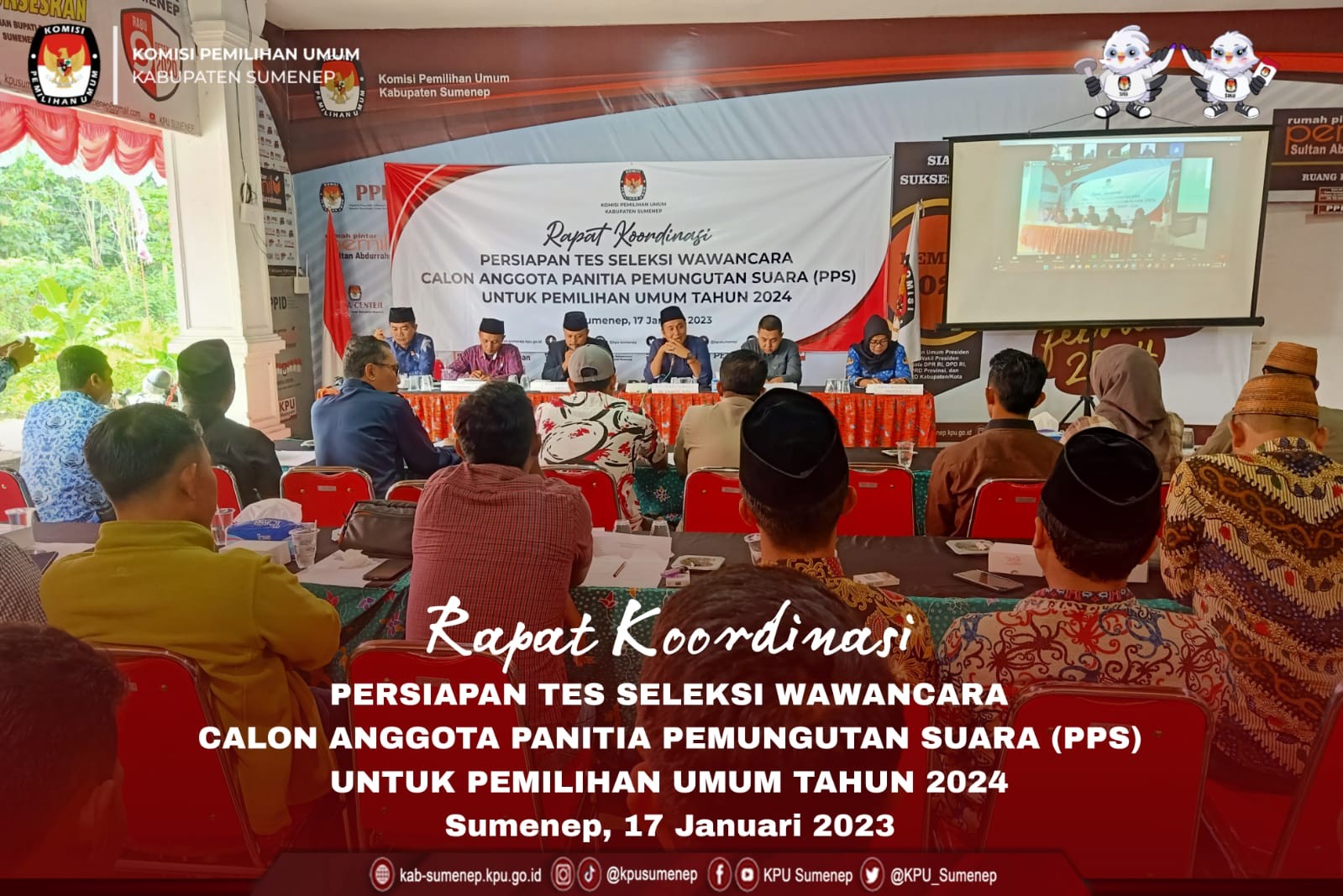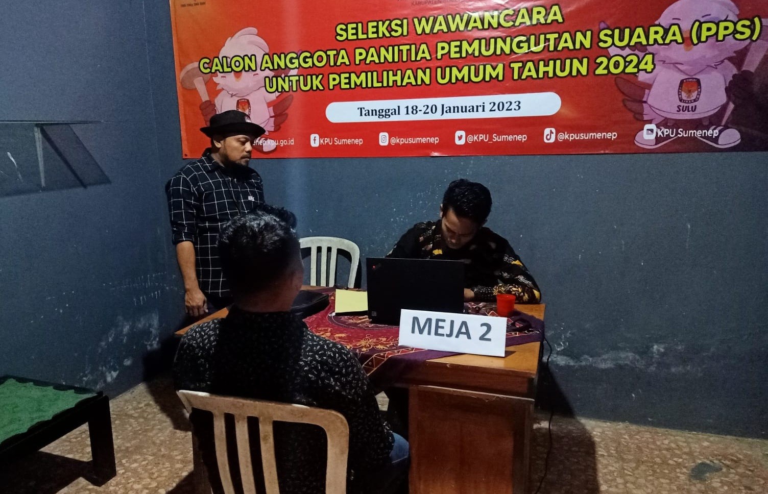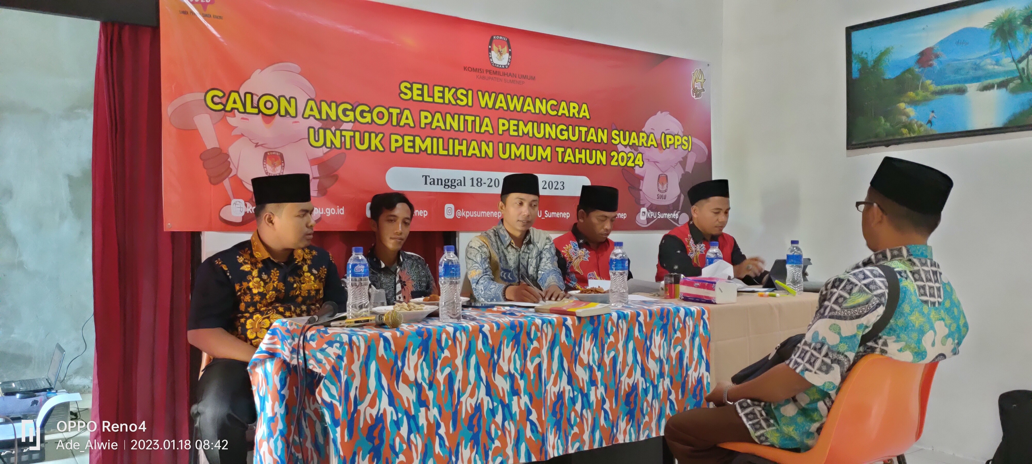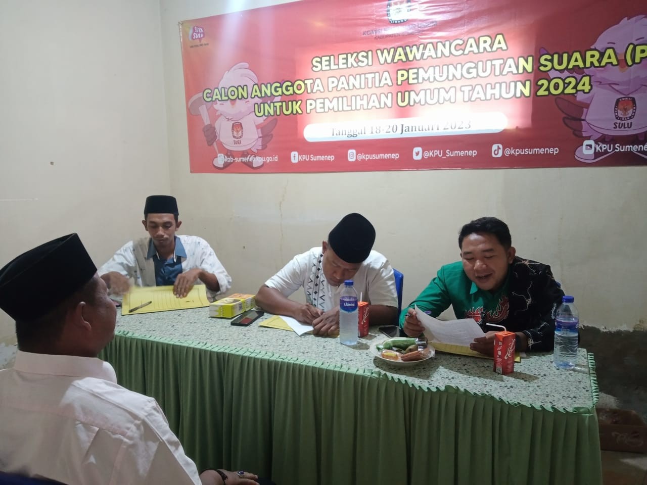 Dungkek-Sumenep, kab-sumenep.kpu.go.id - Panitia Pemilihan Kecamatan (PPK) Kecamatan Dungkek melaksanakan tugas yang diberikan oleh Komisi Pemilihan Umum (KPU) Kabupaten Sumenep yaitu untuk melakukan seleksi tes wawancara kepada calon Anggota Panitia Pemungutan Suara (PPS) se-Kecamatan Dungkek pada Pemilihan Umum tahun 2024. Sebelum pelaksanaan wawancara di tingkat PPK Kecamatan Dungkek, pagi tadi kegiatan diawali dengan apel dan do'a bersama yang dipimpin oleh Syarifuddin Anggota PPK Dungkek demi kelancaran dan kesuksesan penyelenggaraan Pemilu tahun 2024. Seleksi tes wawancara ditempatkan di Aula Gedung Pertanian Kecamatan Dungkek, dan pada hari pertama kali ini Rabu 18 Januari 2024 diikuti oleh 48 (empat puluh delapan) calon Anggota PPS yang berasal dari 7 (tujuh) desa. Menurut Khairul Umam, Anggota PPK Kecamatan Dungkek bahwa seleksi tes wawancara merupakan seleksi akhir yang harus diikuti oleh calon penyelenggara badan adhoc di tingkat desa dalam penyelenggaraan pemilu, sehingga mesti dilakukan dengan maksimal. "Dari tes wawancara ini nantinya kami bisa mengetahui kapasitas dan kapabilitas masing-masing calon anggota PPS untuk pemilu 2024 nanti," tutur Umam. Pelaksanaan tes wawancara ini sesuai dengan jadwal yang telah diumumkan akan dilaksanakan selama dua hari yakni pada hari rabu s/d kamis 18 s/d 19 Januari 2024 ditempat yang sama. Ketua PPK Dungkek, Andriansyah memiliki harapan agar seluruh rangkaian pelaksanaan seleksi tes wawancara di tingkat PPK Kecamatan Dungkek dapat berjalan dengan lancar. "Alhamdulillah hari pertama pelaksanaan seleksi wawancara berjalan lancar, semoga besok juga tetap berjalan lancar sesuai dengan harapan kita bersama" harap Andriansyah. (kontr: Muhammad Rasyidi/ed: ATH/foto: Muhammad Rasyidi)