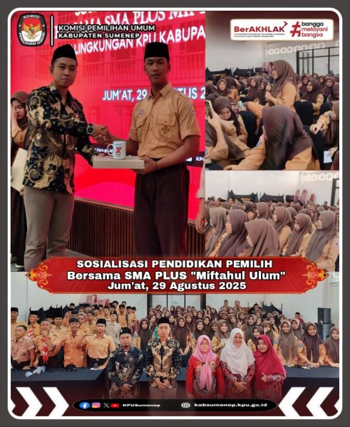 Sumenep, kab-sumenep.kpu.go.id - Komisi Pemilihan Umum (KPU) Kabupaten Sumenep mengadakan Sosialisasi Pendidikan Pemilih Bersama SMA Plus Miftahul Ulum di Lingkungan KPU Kabupaten Sumenep. Bertempat di Aula KPU Kabupaten Sumenep pada Jum'at, 29 Agustus 2025.